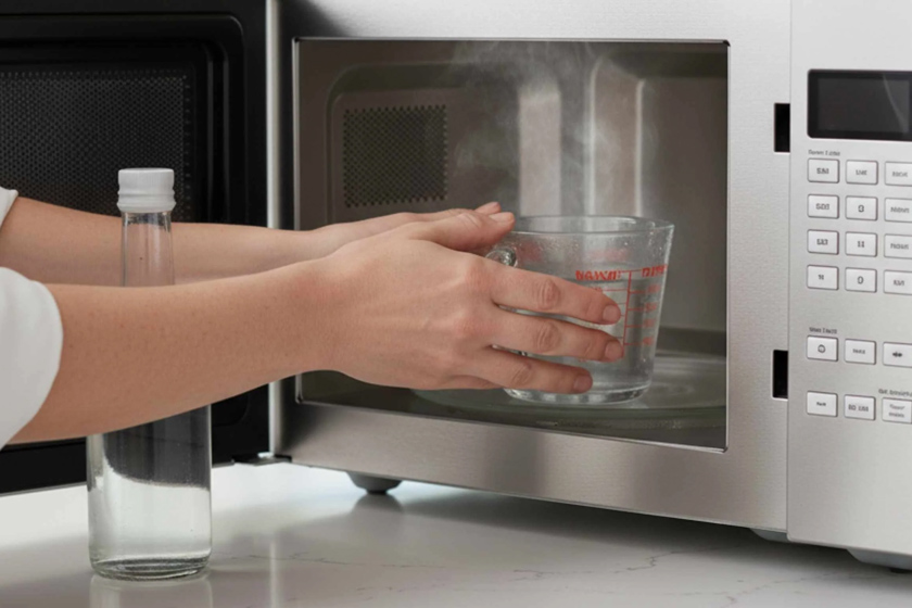 - ظرف را داخل مایکروویو بگذارید و مخلوط آب و سرکه را روی بالاترین درجه، ۱ تا ۲ دقیقه گرم کنید تا بجوشد و بخار کند.