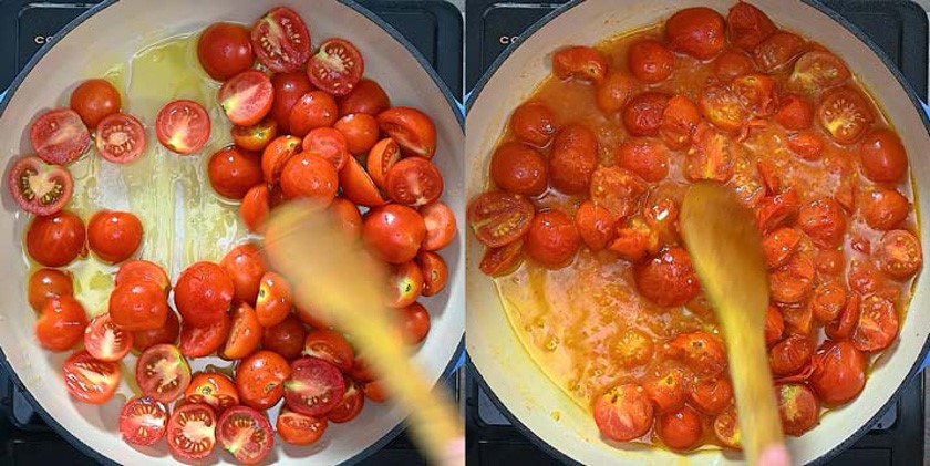 1- آماده کردن فتوچینی را با ریختن آب درون قابلمه و قرار دادن آن روی گاز برای جوشیدن، آغاز کنید. تا زمانی که آب درون قابلمه بهجوش میآید، گوجه فرنگیها را در روغن زیتون روی حرارت متوسط در تابهای به مدت حدود ۱۵ دقیقه تفت دهید، تا زمانی که گوجهها نرم شوند و آب درون آنها گرفته شود.