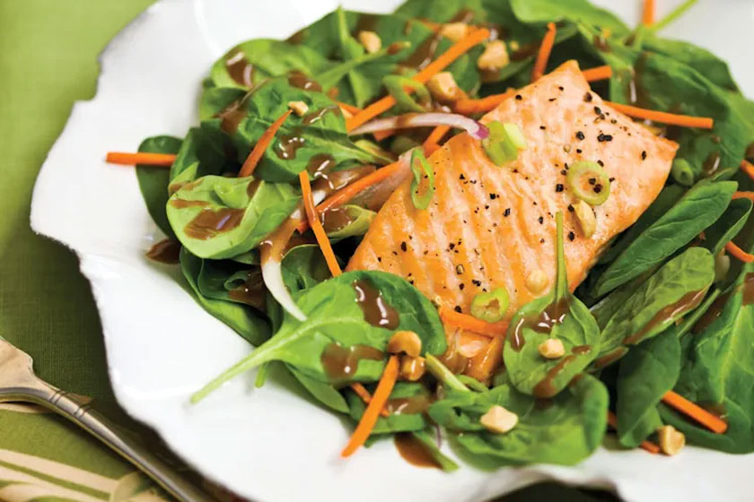 ترکیب اسفناج و ماهی به دلیل وجود امگا ۳، میتواند برای افراد دیابتی مناسب باشد. دقت داشته باشید در این غذا هیچگونه سسی نباید استفاده شود تا چربی اشباع ذخیره شده از نوع سالم وارد بدن شود. در این سالاد از خیار، هویج و سبزیجاتی با نشاسته کم استفاده کنید. فیبر موجود در این غذا باعث سیری میشود و استفاده از سرکه و روغن زیتون در این غذا، به تنظیم قند خون کمک میکند.