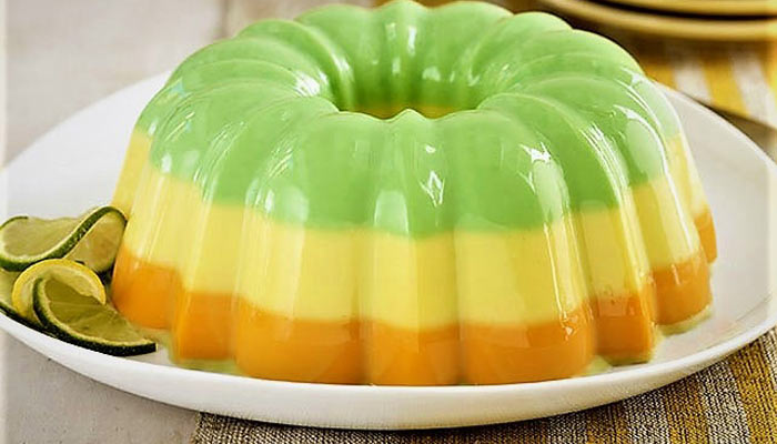 - حال قالب ژله سه طبقه را درون یخچال برای چندین ساعت بگذارید تا کاملاً ببندد.