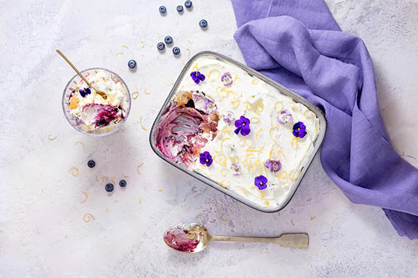 - خامه فرمگرفته، بلوبری تازه، نعنا (اختیاری) برای تزئین