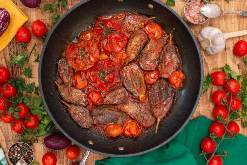 اگر به دنبال یک غذا با بادمجان هستید مطمئنا گوجه بادمجان بهترین گزینه برای شما خواهد بود. جهت تهیه این غذا باید بادمجان‌ها به صورت ورقه‌ای در آب نمک قرار بگیرند تا تلخی آنها گرفته شود. سپس درون یک ماهیتابه به صورت پشت و رو، ورقه‌های بادمجان را سرخ کنید. مقداری گوجه را به همراه سیر و پیاز درون ماهیتابه دیگری تفت دهید. سپس زردچوبه و فلفل به آن بیفزاید و بادمجان‌ها را نیز به آن اضافه کنید و اجازه دهید تمامی مواد بخارپز شوند. طرز تهیه خوراک گوجه و بادمجان سیب زمینی را نیز می توانید در مقاله بخش آموزش آشپزی مجله مطالعه کنید.