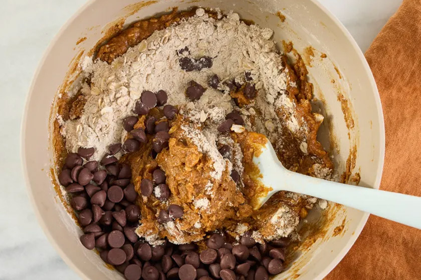 نیمی از مخلوط آرد را به مواد مرطوب اضافه کنید و بهآرامی با لیسک یا قاشق چوبی هم بزنید. سپس چیپس شکلات و باقیماندهی آرد را اضافه کنید و فقط تا زمانی که مواد به هم بچسبند و خمیر یکدست شود، هم بزنید. مانند آنچه در طرز تهیه کوکی شکلاتی چیپسی انجام میدهید، این خمیر را نیز بیش از حد ورز ندهید.